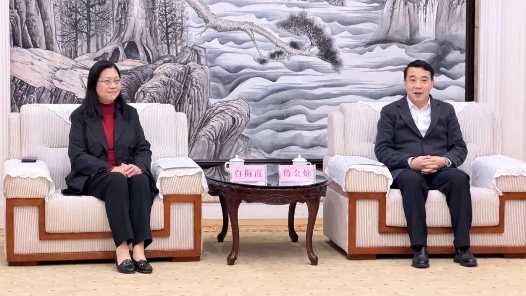 访问期间,白美霞主任会见了随州市委常委、组织部部长、统战部部长詹金灿了解当地特色产业、旅游、文化等领域发展情况,介绍驻武汉办事处职能、香港最新情况及未来工作方向,其中包括上月6日正式开班的“内地企业走出去专班”,进一步促进香港、湖北省与湖北省之间的交流合作随州市.湖北省人民政府外事办公室副主任朱晓斌、香港贸易发展局华中代表、湖北省香港商会常务副会长兼秘书长吴晓晓以及湖北省香港商会代表出席会议。▲ 武汉办事处代主任白美霞(左)会见随州市委常委、组织部部长、统战部部长詹金灿(右)
