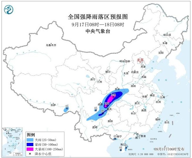 中央气象天文台继续在9月17日下午6点发布黄色警告:预计将于9月17日至9月18日下午80点从9月18日的9月18:00发出大雨,在吉伊州西北部的四川盆地的某些地区将有大雨shaanxi,西北,河南,西南西藏,南部南部,南广东,海南岛和其他地区。其中,大雨(100-240毫米)发生在东北四川盆地和西部重庆的某些地区。上述一些区域伴随着短期大雨(每小时最大的降雨为20-50毫米,本地超过70毫米),以及当地,强烈的对流天气,例如风暴和强风。