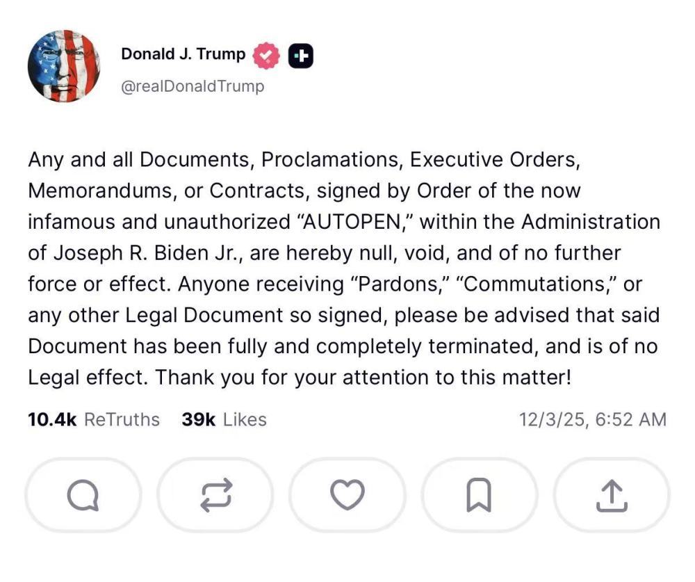 3月17日,特朗普在社交媒体上发文称,赦免无效,因为这些赦免是由自动笔签署的,而不是拜登本人,而且拜登“对此一无所知”。特朗普在帖子中没有提供上述判断的依据。
